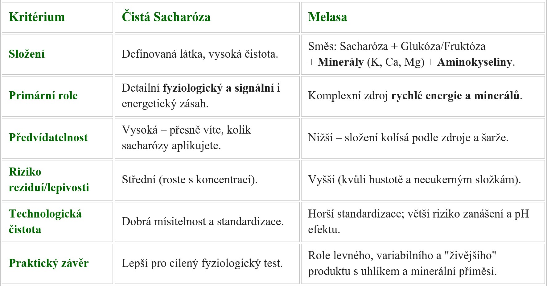 Melasa není pouze levnější sacharóza. Jedná se o odlišný, vícesložkový produkt s proměnlivým složením. Chcete-li testovat čistě fyziologický účinek cukru, používejte čistou sacharózu s doporučeným dávkováním a vhodnou formulací. Díky lepivosti může melasa prodlužovat účinek příjmu všech složek do rostlin, to částečně může eliminovat nižší obsah cukrů. Současně, ale je při použití melasy, díky jejímu lepivému účinku, více nutné brát v úvahu při ošetření v období rozvoje chorob, kombinaci s fungicidy.